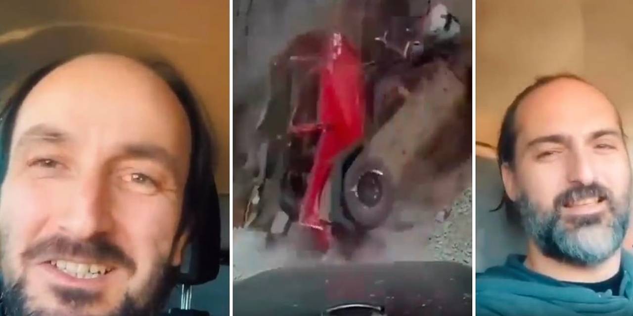 Dağ yamacındaki bir yolun yapımı sırasında bir anda yolun altı boşalırken istinat duvarı çöktü. Heyelanın yaşandığı noktaya birkaç metre mesafedeki iki kişinin şans eseri kurtuluşu kameralara yansıdı.