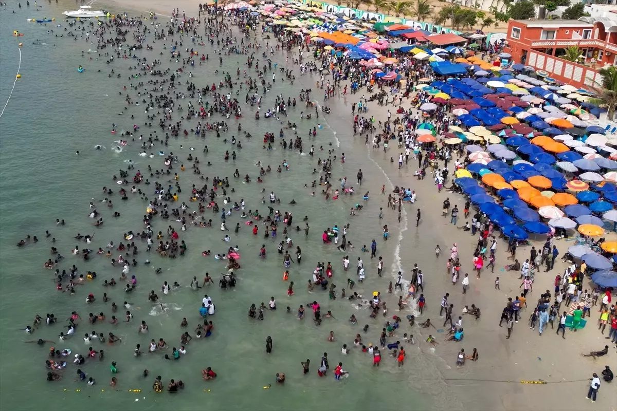 Halka açık plajda adım atacak yer kalmazken, sahil boyu sıralanan şemsiyeler de havadan renkli görüntüler oluşturdu.