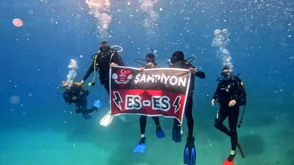 Eskişehirsporlu 7 dalgıçtan oluşan grup, İzmir’de denizde 26 metre derinlikte “Şampiyon ES-Es” yazılı pankartı açtı