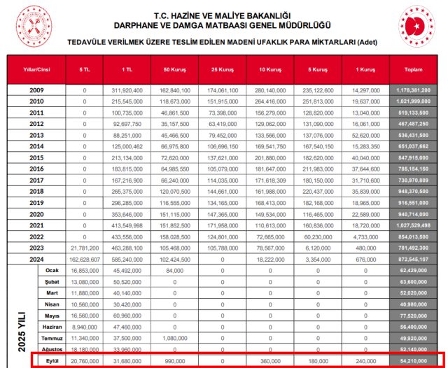 Hazine ve Maliye Bakanlığı'na bağlı Darphane ve Damga Matbaası Genel Müdürlüğü, bir süredir piyasaya sürülmeyen paraları yeniden bastı. 1 kuruştan 240 bin adet, 5 kuruştan 180 bin adet, 10 kuruştan 360 bin adet basıldı. Böylece eylül ayında madeni ufaklık paralar toplamda 54 milyon 210 bin lira oldu.