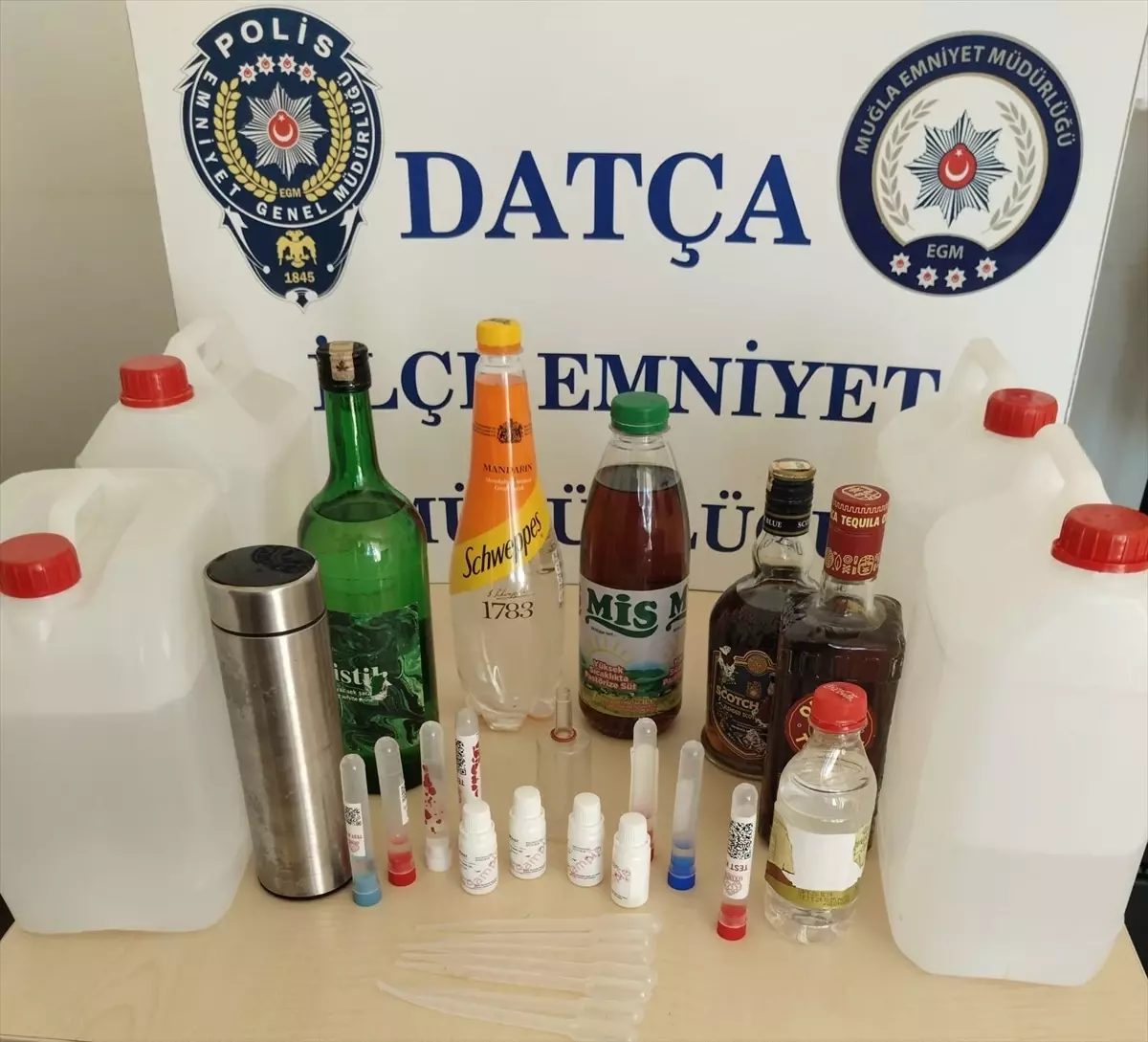 İskele Mahallesi’nde bir evde yapılan aramada, bidon, şişe ve termoslarda alkol ile üretimde kullanılan test kitleri bulundu.