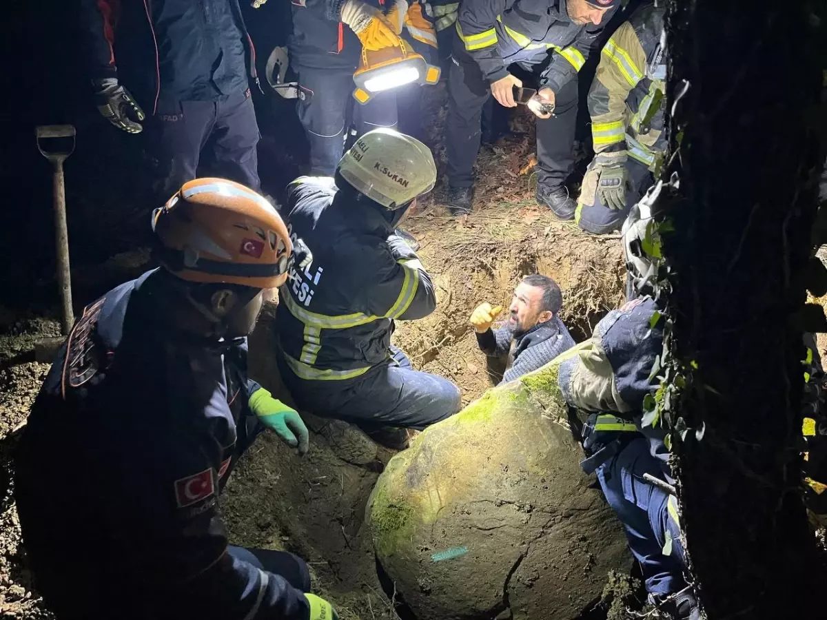 Kocaeli'nin İzmit ilçesinde define ararken kayanın altında kalan Cem Dal, itfaiye ekiplerinin bir saat süren çalışması ile kurtarıldı. Hastaneye kaldırılan Dal'ın hayati tehlikesi bulunmuyor.