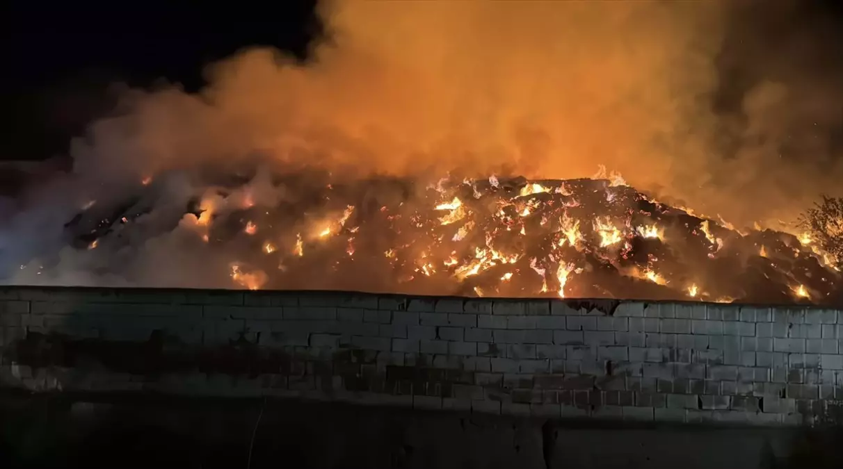 Yaklaşık 600 ton saman balyasının bulunduğu bölgede, ekiplerin yangını söndürme çalışmaları sürüyor.