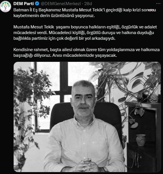 “Batman İl Eş Başkanımız Mustafa Mesut Tekik’i geçirdiği kalp krizi sonucu kaybetmenin derin üzüntüsünü yaşıyoruz. Mustafa Mesut Tekik yaşamı boyunca halkların eşitliği, özgürlük ve adalet mücadelesi verdi. Mücadeleci kişiliği, örgütlü duruşu ve halkına duyduğu bağlılıkla partimiz için çok değerli bir yol arkadaşıydı. Kendisine rahmet, başta ailesi olmak üzere tüm yoldaşlarımıza ve halkımıza başsağlığı diliyoruz. Anısı mücadelemizde yaşayacak” ifadeleri yer aldı.