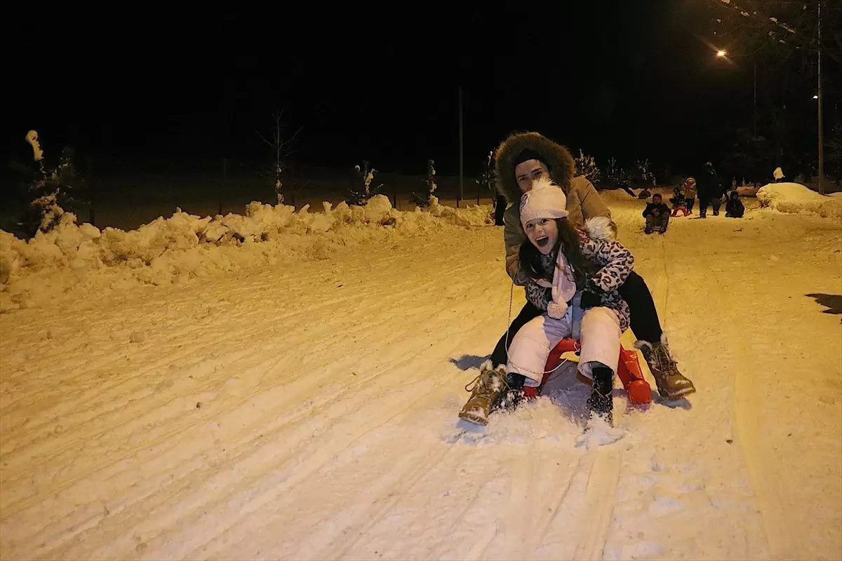 Soğuk havaya aldırış etmeden müzik eşliğinde kızakla kayan aileler ile çocukları doyasıya eğlendi.