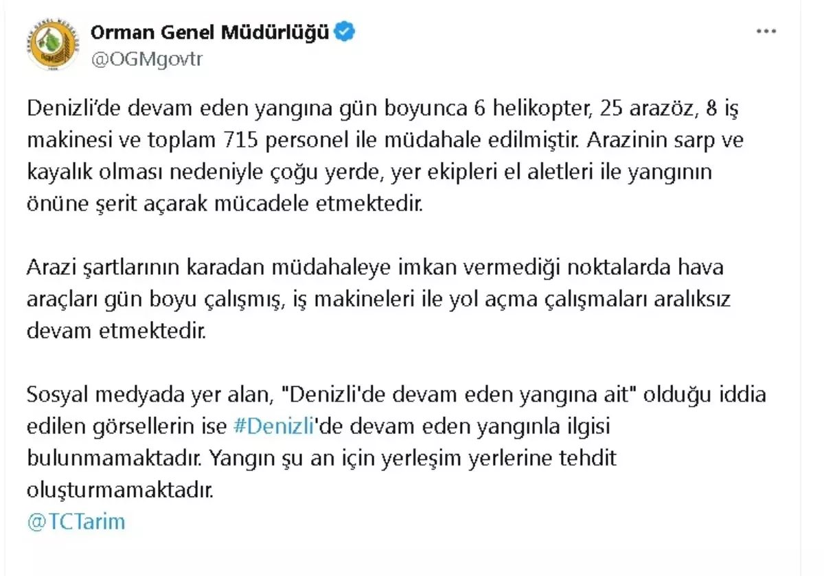 “Arazinin sarp ve kayalık olması nedeniyle çoğu yerde, yer ekipleri el aletleri ile yangının önüne şerit açarak mücadele etmektedir. Arazi şartlarının karadan müdahaleye imkan vermediği noktalarda hava araçları gün boyu çalışmış, iş makineleri ile yol açma çalışmaları aralıksız devam etmektedir. Sosyal medyada yer alan, ‘Denizli’de devam eden yangına ait’ olduğu iddia edilen görsellerin ise Denizli’de devam eden yangınla ilgisi bulunmamaktadır. Yangın şu an için yerleşim yerlerine tehdit oluşturmamaktadır.”