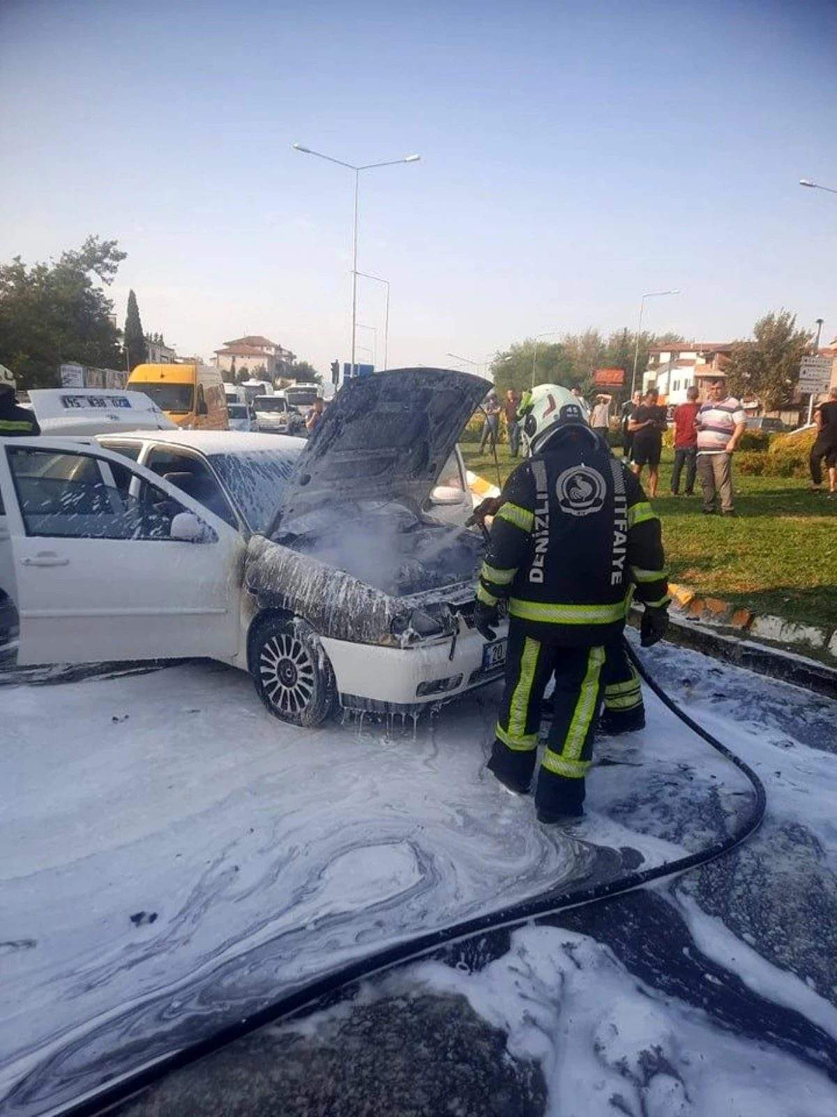 Denizli’de seyir halindeyken alev alan otomobil, çıkan yangında kullanılamaz hale geldi.