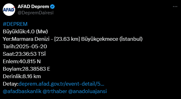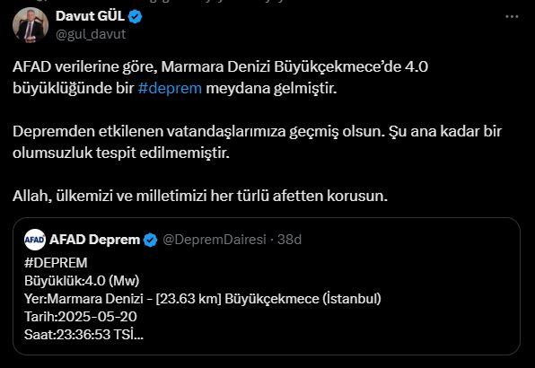 Gül, sosyal medya hesabından yaptığı paylaşımda, “AFAD verilerine göre, Marmara Denizi Büyükçekmece’de 4.0 büyüklüğünde bir deprem meydana gelmiştir. Depremden etkilenen vatandaşlarımıza geçmiş olsun. Şu ana kadar bir olumsuzluk tespit edilmemiştir. Allah, ülkemizi ve milletimizi her türlü afetten korusun” ifadelerini kullandı.