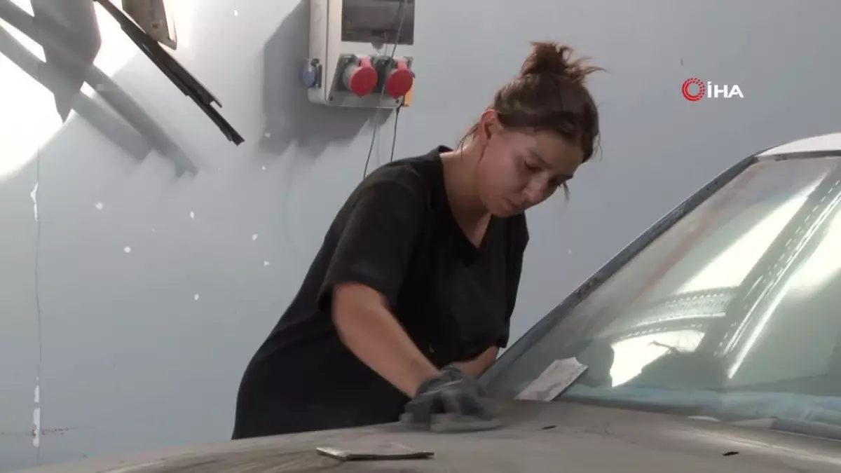 Depremzede genç kadın, yardım için gittiği eşinin dükkanında kaportacı oldu