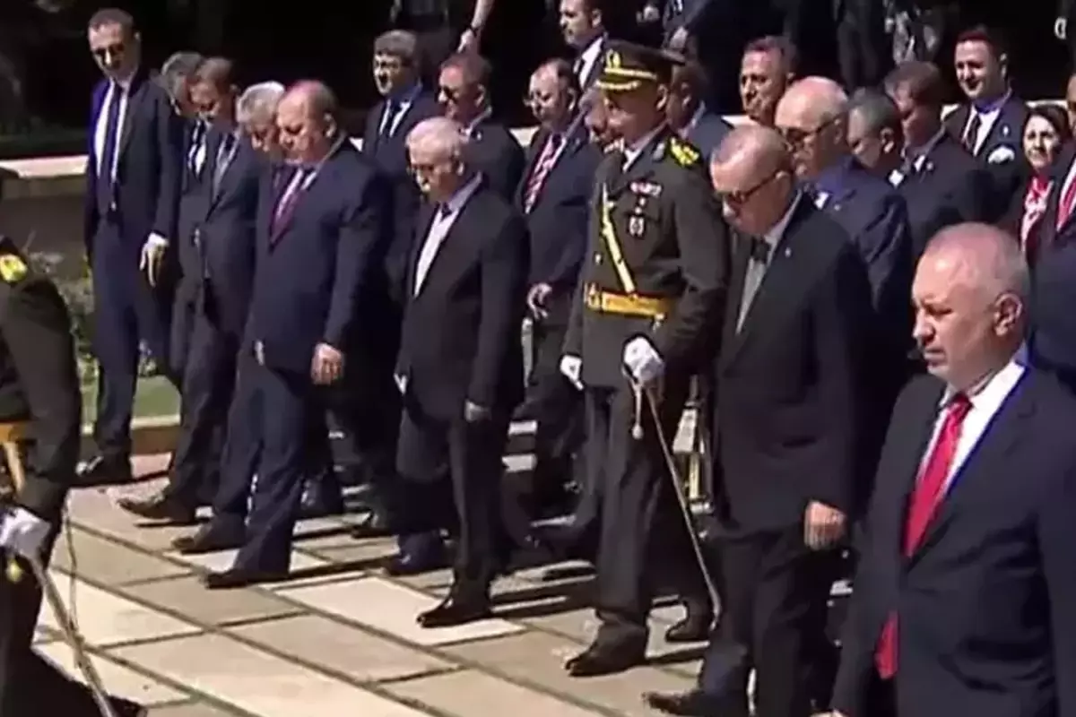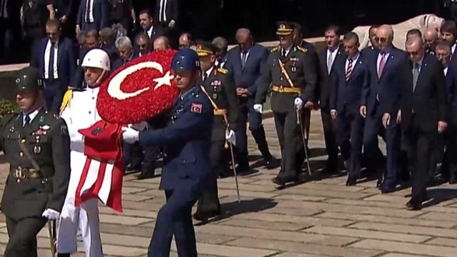 Erdoğan’ın, Atatürk’ün mozolesine ay yıldız motifli çelenk bırakmasının ardından, saygı duruşunda bulunuldu ve İstiklal Marşı okundu. Erdoğan ve törende hazır bulunan devlet erkânı, daha sonra Misak-ı Millî Kulesi’ne geçti. Cumhurbaşkanı Erdoğan, burada Anıtkabir Özel Defteri’ni imzaladı.