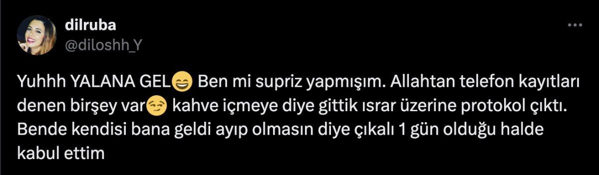 “Yuhhh yalana gel. Ben mi sürpriz yapmışım. Allah’tan telefon kayıtları denen bir şey var. Kahve içmeye diye gittik, ısrar üzerine protokol çıktı. Ben de kendisi bana geldi ayıp olmasın diye çıkalı 1 gün olduğu halde kabul ettim.”