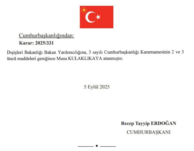 Buna göre; İslam İşbirliği Teşkilatı (İİT) İdari ve Mali İşler Genel Sekreter Yardımcılığı görevinde bulunan Musa Kulaklıkaya, Dışişleri Bakan Yardımcılığı görevine getirildi.