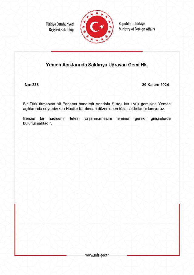 “Bir Türk firmasına ait Panama bandıralı Anadolu S adlı kuru yük gemisine Yemen açıklarında seyrederken Husiler tarafından düzenlenen füze saldırılarını kınıyoruz. Benzer bir hadisenin tekrar yaşanmamasını teminen gerekli girişimlerde bulunulmaktadır.”