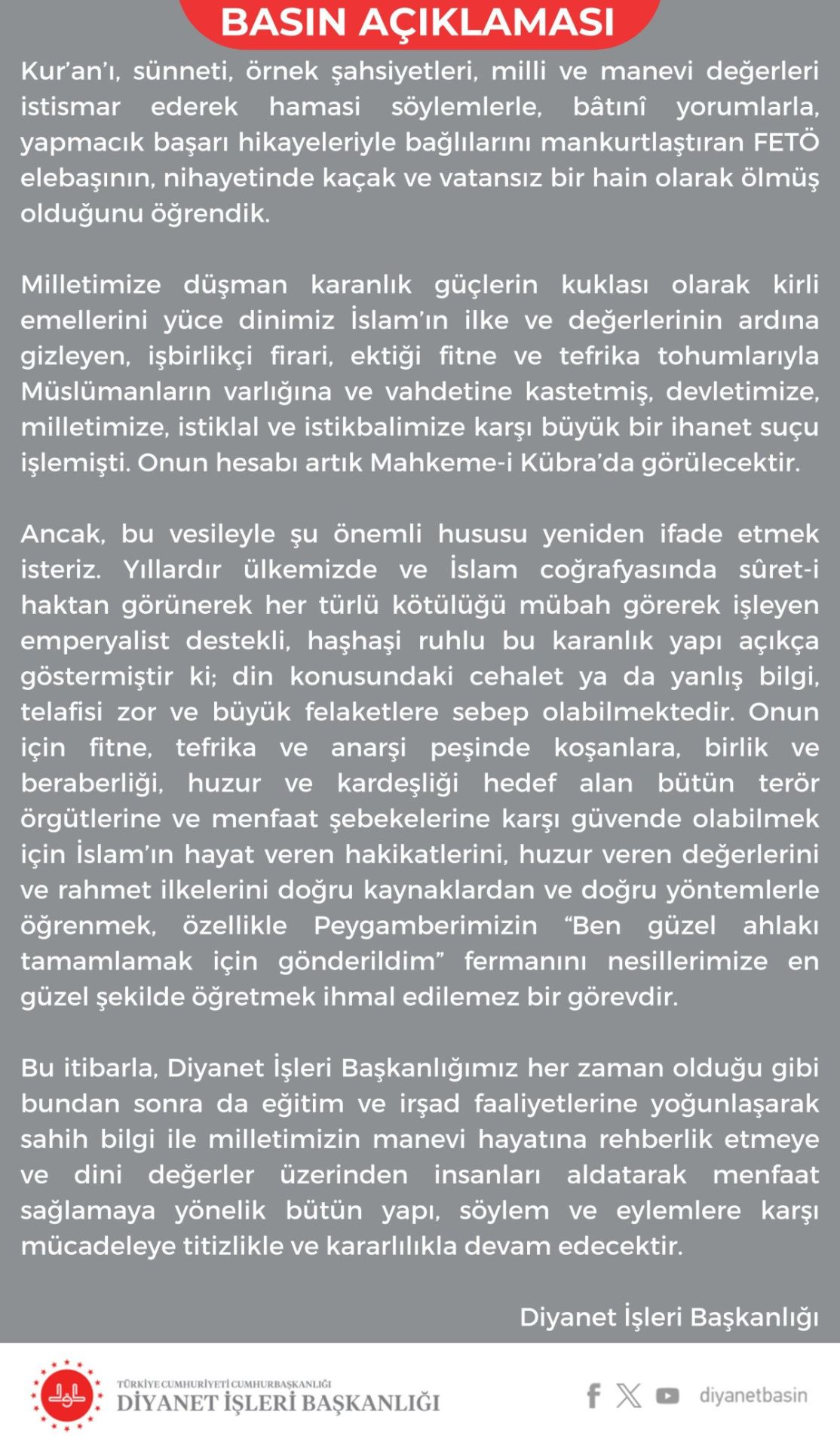 Diyanet İşleri Başkanlığı, FETÖ elebaşı Fettullah Gülen’in ölümüne ilişkin bir açıklama yaptı.