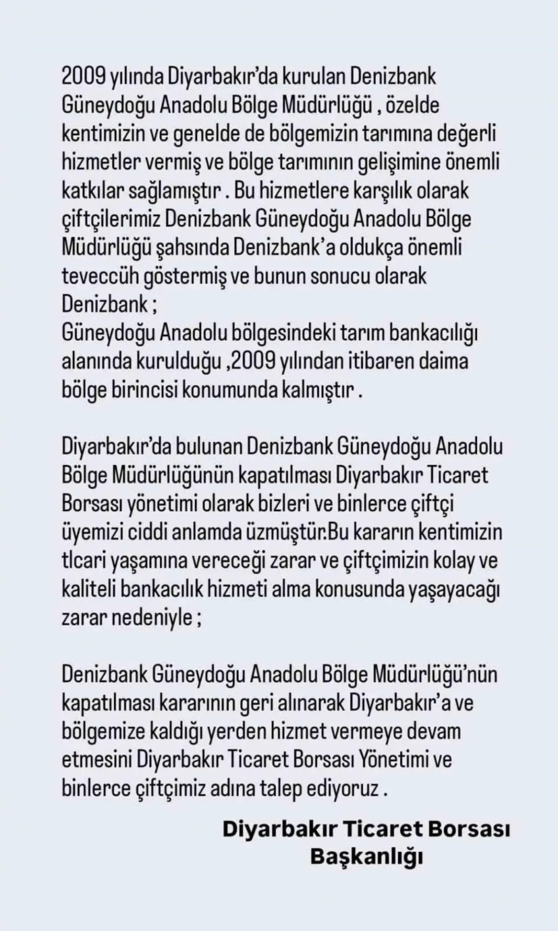 Diyarbakır Ticaret Borsasından yapılan açıklamada, “2009 yılında Diyarbakır’da kurulan Denizbank Güneydoğu Anadolu Bölge Müdürlüğü, özelde kentimizin ve genelde de bölgemizin tarımına değerli hizmetler vermiş ve bölge tarımının gelişimine önemli katkılar sağlamıştır. Bu hizmetlere karşılık olarak çiftçilerimiz Denizbank Güneydoğu Anadolu Bölge Müdürlüğü şahsında Denizbank’a oldukça önemli teveccüh göstermiş ve bunun sonucu olarak Denizbank Güneydoğu Anadolu Bölgesindeki tarım bankacılığı alanında kurulduğu, 2009 yılından itibaren daima bölge birincisi konumunda kalmıştır. Diyarbakır’da bulunan Denizbank Güneydoğu Anadolu Bölge Müdürlüğünün kapatılması Diyarbakır Ticaret Borsası yönetimi olarak bizleri ve binlerce çiftçi üyemizi ciddi anlamda üzmüştür. Bu kararın kentimizin ticari yaşamına vereceği zarar ve çiftçimizin kolay ve kaliteli bankacılık hizmeti alma konusunda yaşayacağı zarar nedeniyle Denizbank Güneydoğu Anadolu Bölge Müdürlüğünün kapatılması kararının geri alınarak Diyarbakır’a ve bölgemize kaldığı yerden hizmet vermeye devam etmesini Diyarbakır Ticaret Borsası Yönetimi ve binlerce çiftçimiz adına talep ediyoruz” denildi. – DİYARBAKIR