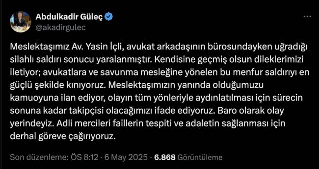 “Meslektaşımız Av. Yasin İçli, avukat arkadaşının bürosundayken uğradığı silahlı saldırı sonucu yaralanmıştır. Kendisine geçmiş olsun dileklerimizi iletiyor; avukatlara ve savunma mesleğine yönelen bu menfur saldırıyı en güçlü şekilde kınıyoruz.