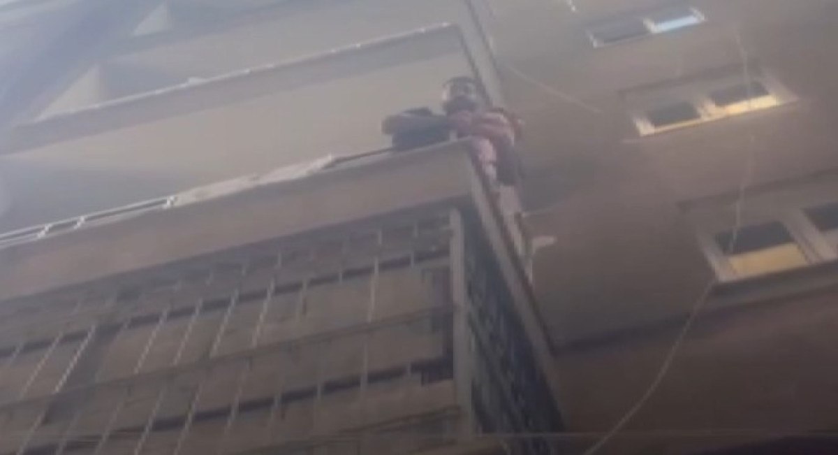 Balkon korkuluklarına çıkıp düşme tehlikesi geçiren kız çocuğunu, 3. kata tırmanan Suriyeli Abdullah Ahmed kurtarırken o anlar görüntülendi.