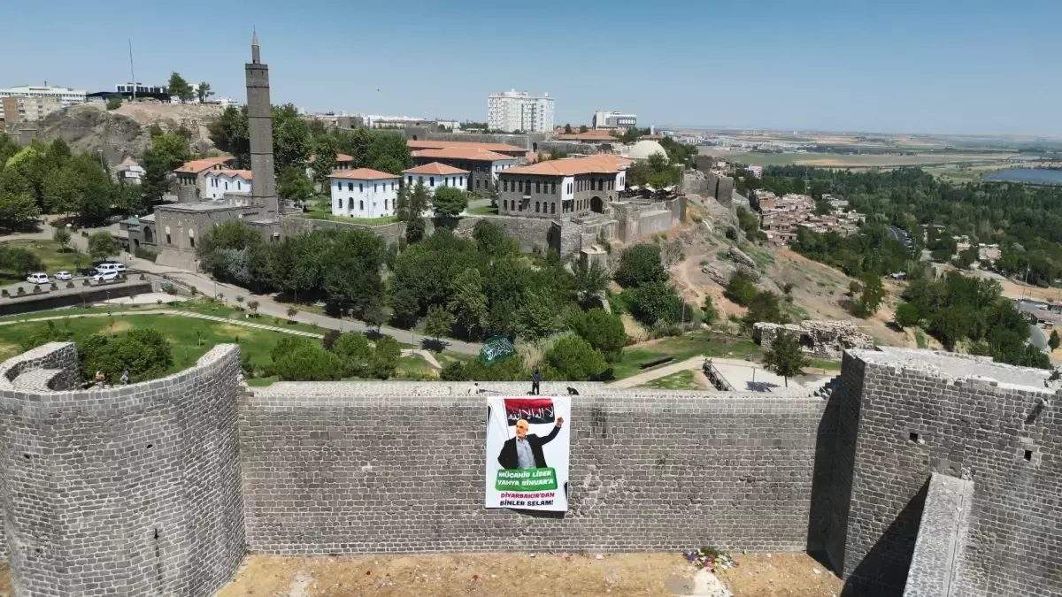 Kentte bir grup, yeni seçilen Hamas Siyasi Büro Şefi Yahya Sinvar’ın posterini, Sur ilçesinde bulunan tarihi surlara astı. Posterin üzerinde, ‘Mücahit lider Yahya Sinvar’a Diyarbakır’dan binler selam’ yazısının olduğu görüldü.
