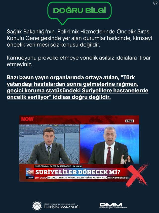 Cumhurbaşkanlığı İletişim Başkanlığı Dezenformasyonla Mücadele Merkezi (DMM), "Türk vatandaşı hastalardan sonra gelmelerine rağmen, geçici koruma statüsündeki Suriyelilere hastanelerde öncelik veriliyor" iddiasının doğru olmadığını bildirdi.