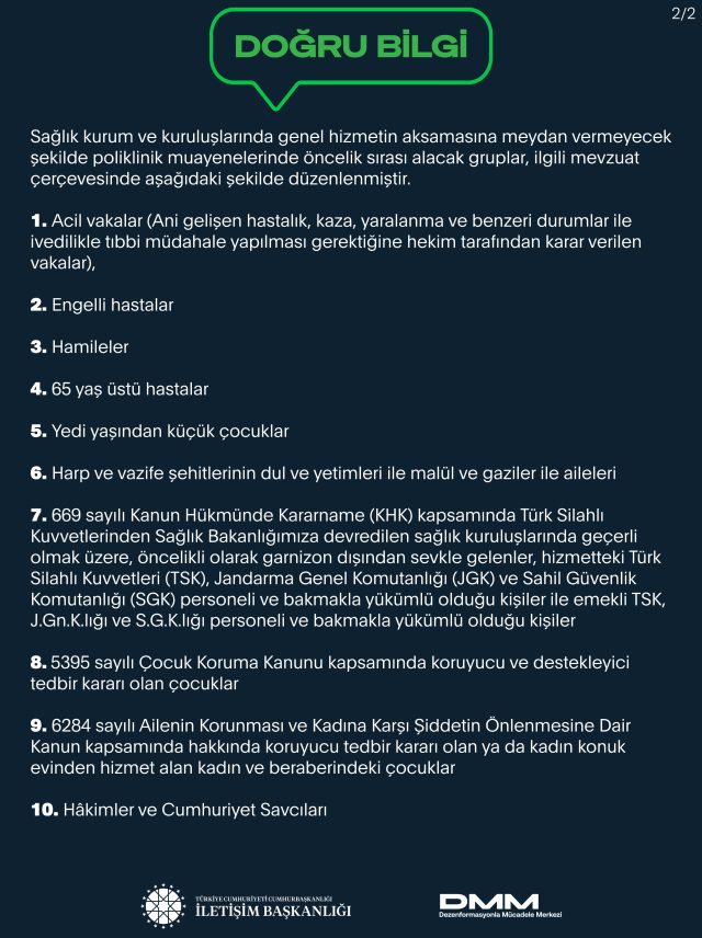 Söz konusu iddiaya ilişkin Cumhurbaşkanlığı İletişim Başkanlığı Dezenformasyonla Mücadele Merkezi’nden (DMM) açıklama geldi. İddianın gerçeği yansıtmadığı belirtilen açıklamada, Sağlık Bakanlığı’nın, Poliklinik Hizmetlerinde Öncelik Sırası Konulu Genelgesi’nde yer alan durumlar haricinde, kimseye öncelik verilmesinin söz konusu olmadığına dikkati çekildi.
