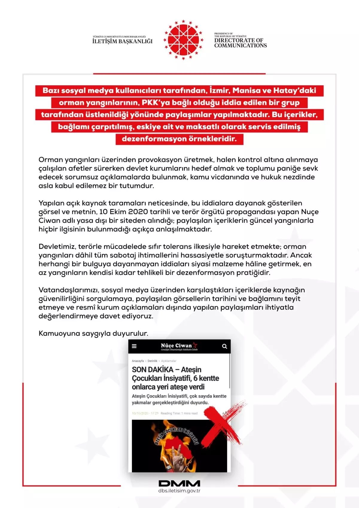 CUMHURBAŞKANLIĞI İletişim Başkanlığı Dezenformasyonla Mücadele Merkezi’nden (DMM) yapılan açıklamada, “Bazı sosyal medya kullanıcıları tarafından, İzmir, Manisa ve Hatay’daki orman yangınlarının, PKK’ya bağlı olduğu iddia edilen bir grup tarafından üstlenildiği yönünde paylaşımlar yapılmaktadır. Bu içerikler, bağlamı çarpıtılmış, eskiye ait ve maksatlı olarak servis edilmiş dezenformasyon örnekleridir” ifadelerine yer verildi.