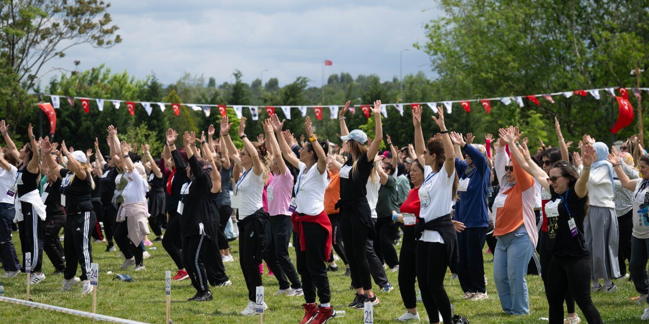 Rengarenk spor kıyafetleriyle alanı dolduran kadınlar, müzik eşliğinde profesyonel eğitmenlerin komutlarıyla aynı anda aerobik yaptı.