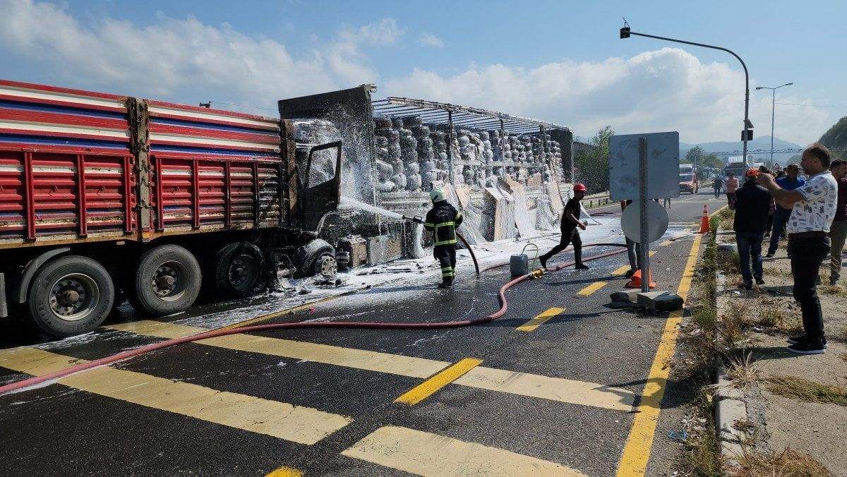 İtfaiye ekiplerinin müdahalesi ile alevler söndürülürken, tır kullanılamaz hale geldi.