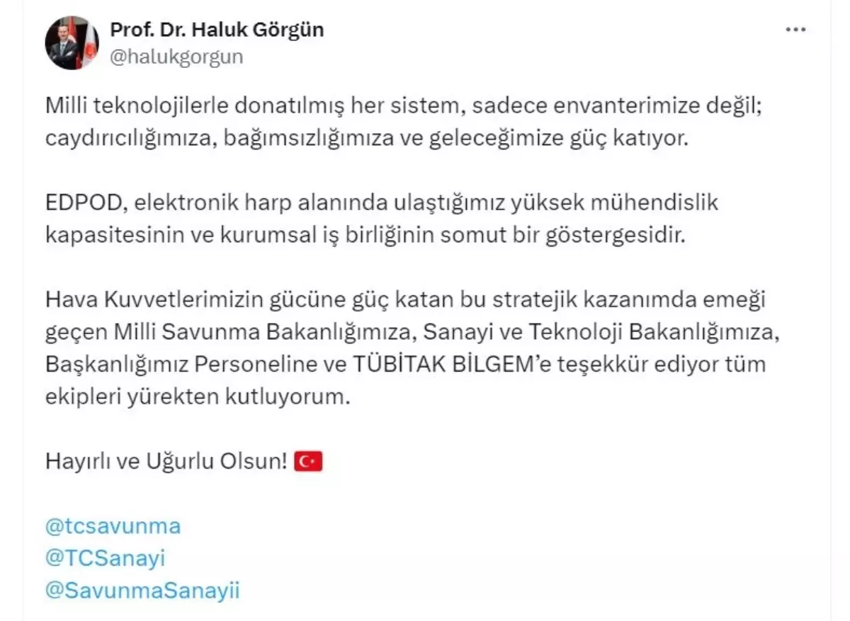 Savunma Sanayii Başkanı Haluk Görgün de konuyla ilgili sosyal medya hesabından açıklama yaptı. Görgün, “Milli teknolojilerle donatılmış her sistem, sadece envanterimize değil; caydırıcılığımıza, bağımsızlığımıza ve geleceğimize güç katıyor. EDPOD, elektronik harp alanında ulaştığımız yüksek mühendislik kapasitesinin ve kurumsal iş birliğinin somut bir göstergesidir. Hava Kuvvetlerimizin gücüne güç katan bu stratejik kazanımda emeği geçen Milli Savunma Bakanlığımıza, Sanayi ve Teknoloji Bakanlığımıza, Başkanlığımız Personeline ve TÜBİTAK BİLGEM’e teşekkür ediyor tüm ekipleri yürekten kutluyorum. Hayırlı ve uğurlu olsun” ifadelerini kullandı.