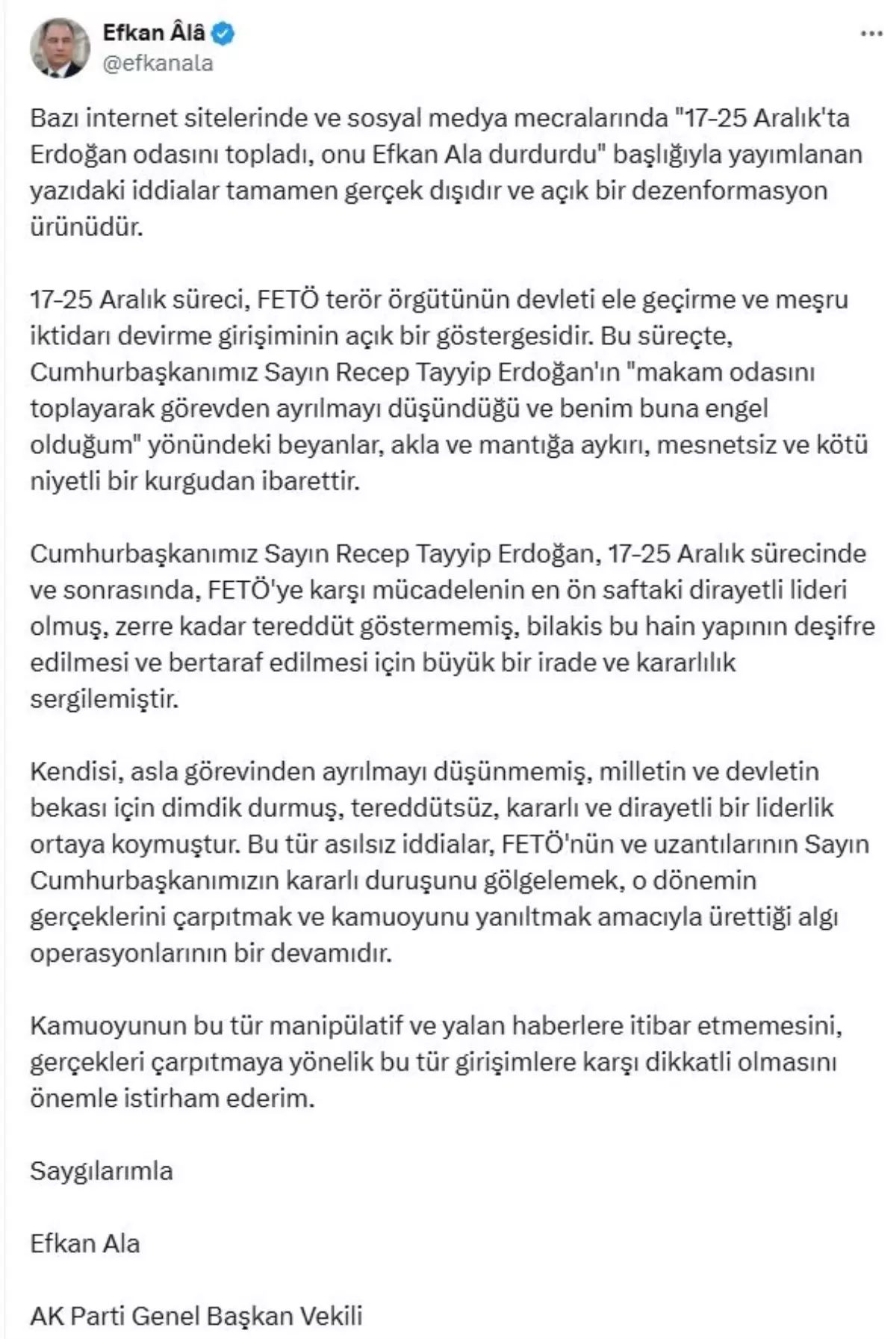 AK Parti Genel Başkan Vekili Efkan Ala, sosyal medya hesabından yaptığı açıklamada, bazı internet sitelerinde ve sosyal medya mecralarında ’17-25 Aralık’ta Erdoğan odasını topladı, onu Efkan Ala durdurdu’ başlığıyla yazı yayımlandığını belirterek, “Yazıdaki iddialar tamamen gerçek dışıdır ve açık bir dezenformasyon ürünüdür. 17-25 Aralık süreci, FETÖ terör örgütünün devleti ele geçirme ve meşru iktidarı devirme girişiminin açık bir göstergesidir. Bu süreçte, Cumhurbaşkanımız Sayın Recep Tayyip Erdoğan’ın ‘makam odasını toplayarak görevden ayrılmayı düşündüğü ve benim buna engel olduğum’ yönündeki beyanlar, akla ve mantığa aykırı, mesnetsiz ve kötü niyetli bir kurgudan ibarettir. Cumhurbaşkanımız Sayın Recep Tayyip Erdoğan, 17-25 Aralık sürecinde ve sonrasında, FETÖ’ye karşı mücadelenin en ön saftaki dirayetli lideri olmuş, zerre kadar tereddüt göstermemiş, bilakis bu hain yapının deşifre edilmesi ve bertaraf edilmesi için büyük bir irade ve kararlılık sergilemiştir. Kendisi, asla görevinden ayrılmayı düşünmemiş, milletin ve devletin bekası için dimdik durmuş, tereddütsüz, kararlı ve dirayetli bir liderlik ortaya koymuştur. Bu tür asılsız iddialar, FETÖ’nün ve uzantılarının Sayın Cumhurbaşkanımızın kararlı duruşunu gölgelemek, o dönemin gerçeklerini çarpıtmak ve kamuoyunu yanıltmak amacıyla ürettiği algı operasyonlarının bir devamıdır. Kamuoyunun bu tür manipülatif ve yalan haberlere itibar etmemesini, gerçekleri çarpıtmaya yönelik bu tür girişimlere karşı dikkatli olmasını önemle istirham ederim” ifadelerini kullandı.