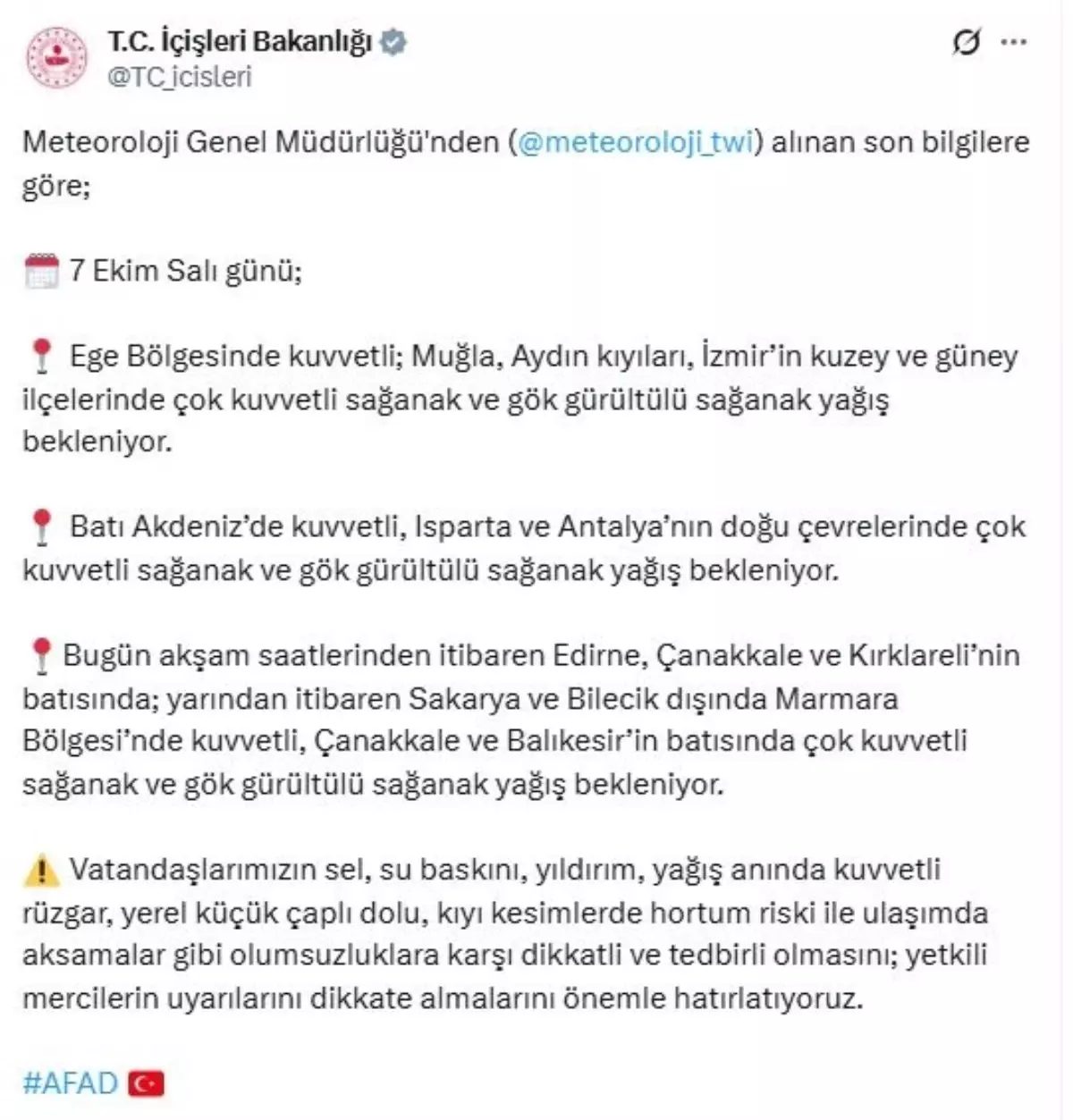 Bakanlığın sosyal medya hesabından yapılan açıklamada, ” Meteoroloji Genel Müdürlüğü’nden alınan son bilgilere göre; 7 Ekim Salı günü Ege Bölgesi’nde kuvvetli; Muğla, Aydın kıyıları, İzmir’in kuzey ve güney ilçelerinde çok kuvvetli sağanak ve gök gürültülü sağanak yağış bekleniyor. Batı Akdeniz’de kuvvetli, Isparta ve Antalya’nın doğu çevrelerinde çok kuvvetli sağanak ve gök gürültülü sağanak yağış bekleniyor. Bugün akşam saatlerinden itibaren Edirne, Çanakkale ve Kırklareli’nin batısında; yarından itibaren Sakarya ve Bilecik dışında Marmara Bölgesi’nde kuvvetli, Çanakkale ve Balıkesir’in batısında çok kuvvetli sağanak ve gök gürültülü sağanak yağış bekleniyor. Vatandaşlarımızın sel, su baskını, yıldırım, yağış anında kuvvetli rüzgar, yerel küçük çaplı dolu, kıyı kesimlerde hortum riski ile ulaşımda aksamalar gibi olumsuzluklara karşı dikkatli ve tedbirli olmasını; yetkili mercilerin uyarılarını dikkate almalarını önemle hatırlatıyoruz” denildi.