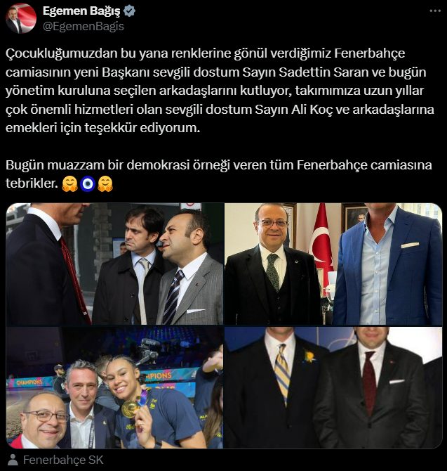 Fenerbahçe’de yapılan olağanüstü seçimli genel kurulun ardından camiadan gelen tebrik mesajlarına bir yenisi daha eklendi. Eski Avrupa Birliği Bakanı Egemen Bağış, sosyal medya hesabından yaptığı paylaşımla hem yeni başkan Sadettin Saran’ı hem de eski başkan Ali Koç’u kutladı.