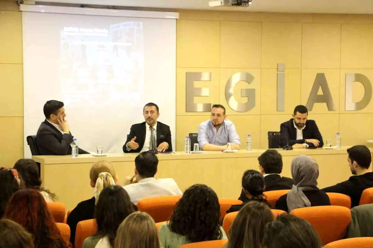 EGİAD Yönetim Kurulu Başkanı Alp Avni Yelkenbiçer, genç neslin kendileri için büyük önem taşıdığına vurgu yaparak, genç işsizlik rakamlarını düşürebilmek adına küçük de olsa bir katkı sunmayı hedeflediklerini dile getirdi. Moderatörlüğünü yaptığı programda gençlere başarı tüyoları da veren Yelkenbiçer, “Genellikle, başarı alıştığımızın dışında bir yerde bulunur. Hayatımızı daha iyi bir hale getirmek istiyorsak, alışılmadık yerlere yani konfor alanımızın dışına gitmeliyiz. Konfor alanımız, bizi rahat ettiren, güvende hissettiğimiz ve rutin davranışlar sergilediğimiz bir yerdir. Ancak, bu alandan uzaklaşmak, gelişmek ve büyümek için önemlidir” dedi. Rekaberlik vurgusuna da değinen Yelkenbiçer, “İyi bir gelecek inşa etmek için birbirimizle ve doğayla uyum içinde, ortak amaçlar doğrultusunda çalışmalıyız. Bu yolculukta her birimizin rolü, sadece kendi başarımızı değil, hepimizin refahını gözetmek olmalıdır. Rekaberlik, yalnızca iş dünyasına değil, tüm toplumsal yapıya yön verecek ve geleceğimizi şekillendirecek anahtar niteliğinde, bunu da göz ardı etmemeliyiz” ifadelerini kullandı.
