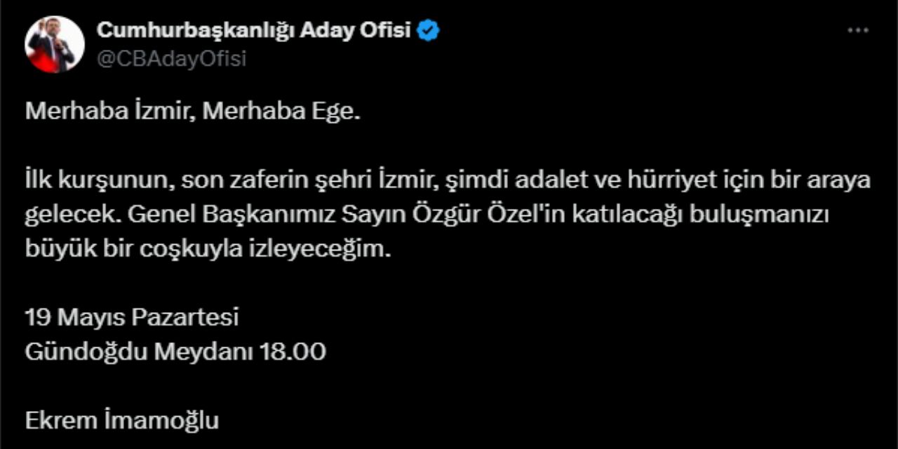 CHP’de Büyük İzmir Mitingi için hazırlıklar sürerken İBB Başkanı ve Cumhurbaşkanı adayı Ekrem İmamoğlu’ndan paylaşım geldi.