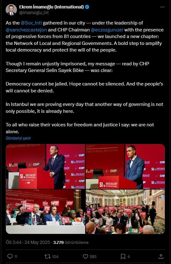 “Sosyalist Enternasyonal şehrimizde bir araya geldikçe – Pedro Sánchez ve CHP Genel Başkanı Özgür Özel liderliğinde 81 ülkeden ilerici güçlerin katılımıyla – yeni bir bölüm başlattık: