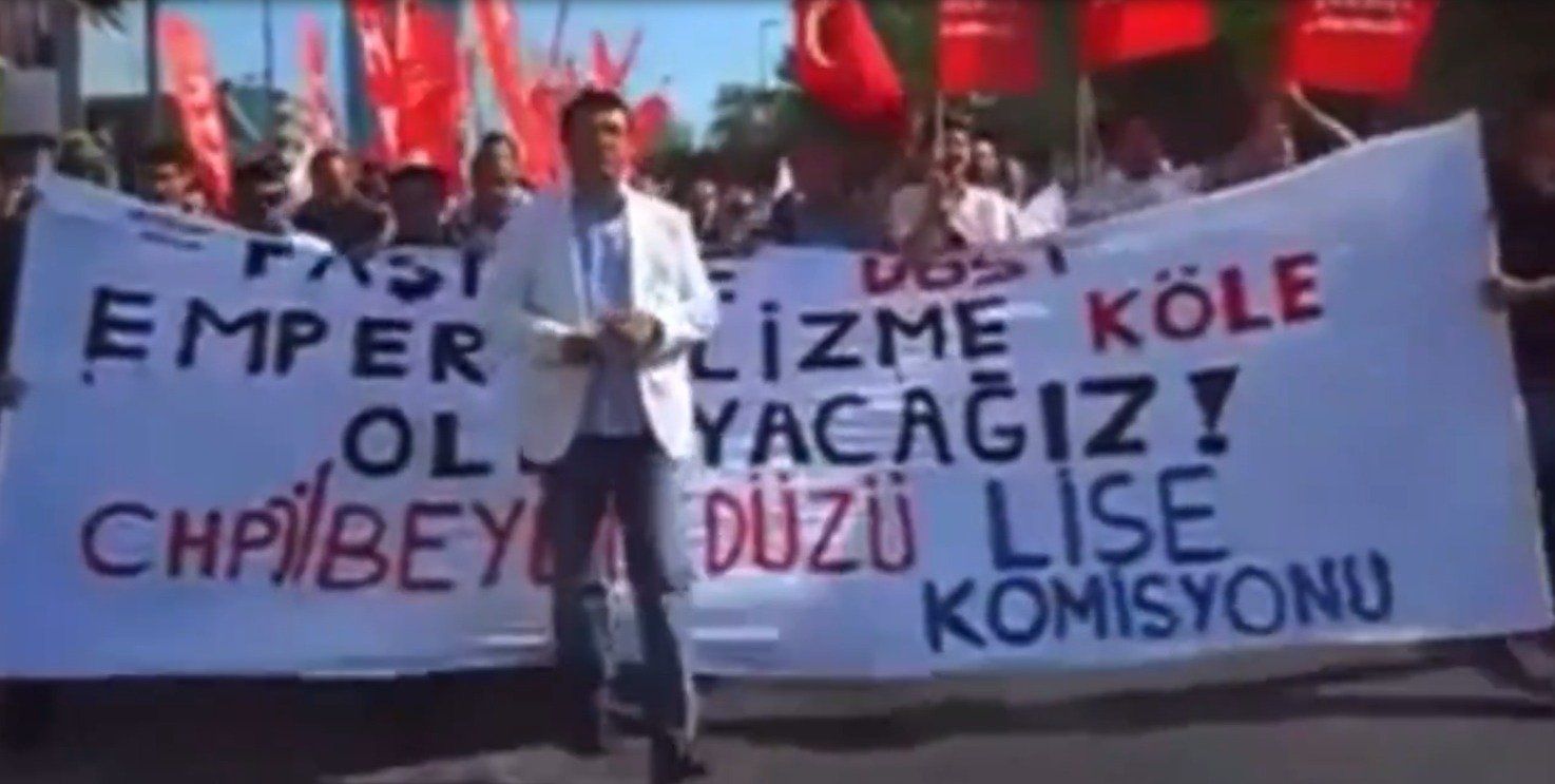 Dönemin CHP Beylikdüzü İl Başkanı olan İmamoğlu’nun görüntülerde “Faşizme dost, emperyalizme köle olmayacağız” yazılı pankartının önüde yurttaşlara yürdüğü görülüyor.