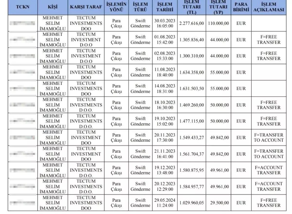 Rapora göre, İmamoğlu’nun oğlu Mehmet Selim İmamoğlu’nun ‘Tectum Investment D.O.O.’ adlı Hırvatistan’daki bir şirkete 2023 ve 2024 yıllarında toplam 637 bin 106 Euro tutarında gönderme işlemi gerçekleştirdiği, Hırvatistan’da yerleşik olan bu şirketin Mehmet Selim İmamoğlu’na ait olduğu aktarıldı.