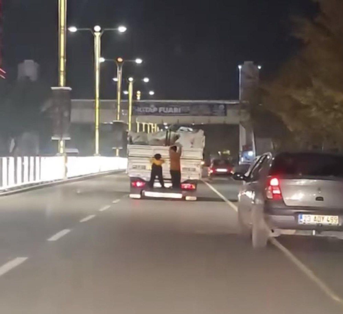 2 çocuğun seyir halindeki kamyonetin arkasına asılarak gittiği anlar cep telefonu kamerasına yansıdı.