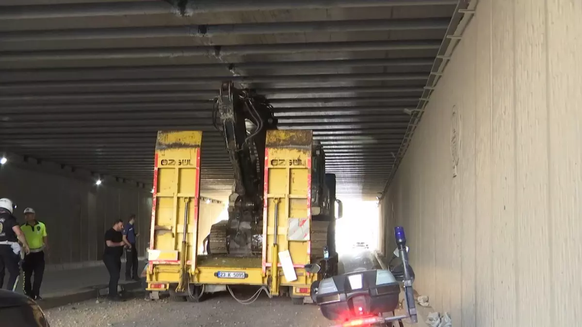 ELAZIĞ’da, TIR, taşıdığı iş makinesi ile alt geçitte sıkıştı. 1,5 saatlik çalışmanın ardından TIR ve iş makinesinin lastikleri indirilerek sıkıştıkları alt geçitten kurtarıldı.