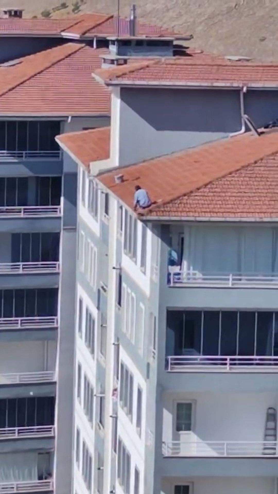 Çatının en ucunda güvenliksiz bir şekilde çalışan şahıs, yürekleri ağza getirdi.