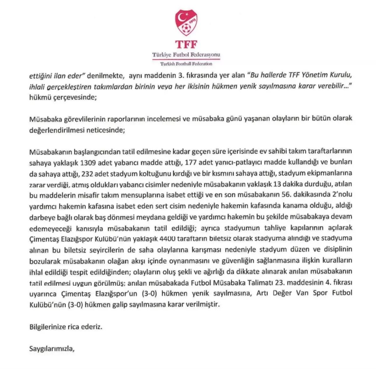 “Müsabakanın başlangıcından tatil edilmesine kadar geçen süre içerisinde ev sahibi takım taraftarlarının sahaya yaklaşık 1309 adet yabancı madde attığı, 177 adet yanıcı-patlayıcı madde kullandığı ve bunları da sahaya attığı, 232 adet stadyum koltuğunu kırdığı ve bir kısmını sahaya attığı, stadyum ekipmanlarına zarar verdiği, atmış oldukları yabancı cisimler nedeniyle müsabakanın yaklaşık 13 dakika durduğu, atılan bu maddelerin misafir takım mensuplarına isabet ettiği ve en son müsabakanın 56. dakikasında 2’nolu yardımcı hakemin kafasına isabet eden sert cisim nedeniyle hakemin kafasında kanama olduğu, aldığı darbeye bağlı olarak baş dönmesi meydana geldiği ve yardımcı hakemin bu şekilde müsabakaya devam edemeyeceği kanısıyla müsabakanın tatil edildiği; ayrıca stadyumun tahliye kapılarının açılarak Çimentaş Elazığspor Kulübü’nün yaklaşık 4400 taraftarın biletsiz olarak stadyuma alındığı ve stadyuma alınan bu biletsiz seyircilerin de saha olaylarına karışması nedeniyle stadyum düzen ve disiplinin bozularak müsabakanın olağan akışı içinde oynanmasını ve güvenliğin sağlanmasına ilişkin kuralların ihlal edildiği tespit edildiğinden; olayların oluş şekli ve ağırlığı da dikkate alınarak anılan müsabakanın tatil edilmesi uygun görülmüş; anılan müsabakada Futbol Müsabaka Talimatı 23. maddesinin 4. fıkrası uyarınca Çimentaş Elazığspor’un (3-0) hükmen yenik sayılmasına, Artı Değer Van Spor Futbol Kulübü’nün (3-0) hükmen galip sayılmasına karar verilmiştir.”