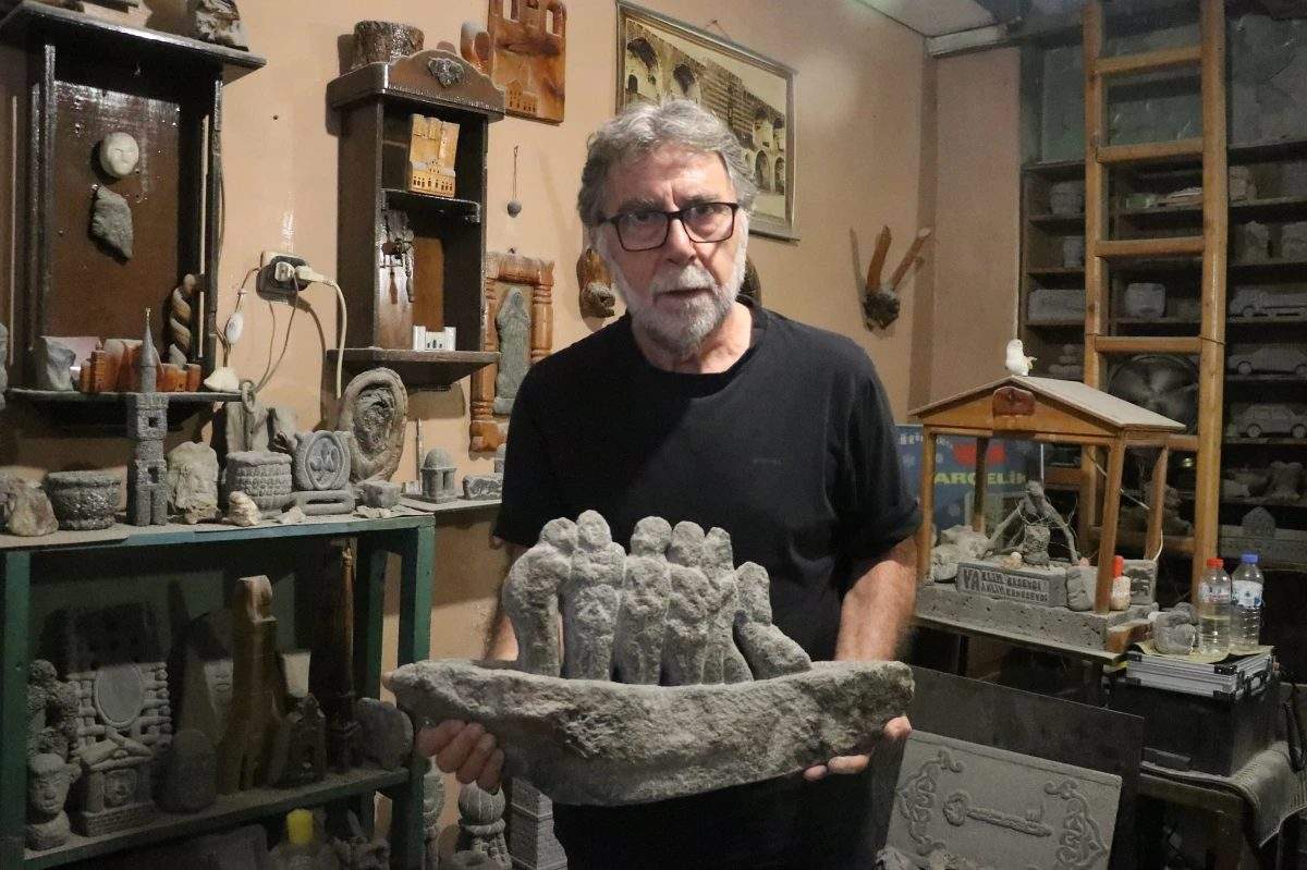 DİYARBAKIR’da, emekli Fransızca öğretmeni Mahmut Nurettin Medyelioğulları (71), 20 yıldır Sur ilçesinde açtığı 10 metrekarelik küçük dükkanda, merakı olan taş işlemeciliği ile 500 civarında eser üretti. Sönmüş volkanik dağ olan Karacadağ’dan topladığı taşlarla, sadece çekiç ve keski gibi el aletleri kullanıp objeler üreten Medyelioğulları, son olarak tek parça bazalt taşından Nuh’un Gemisi figürünü yaptı. Eserlerini satmadığını, yetkililerce açılacak bir sanat ve kültür atölyesinde sergilenmesini istediğini dile getiren Medyelioğulları, “Bu işte bazen taş sizi yönlendiriyor. Gemiye benzer bir şey çıkınca, ‘Tamam, bunu Nuh’un Gemisi yaparım’ dedim. Nuh’un Gemisi’nde insan, hayvan, çeşitli figürler ortaya çıktı” dedi.