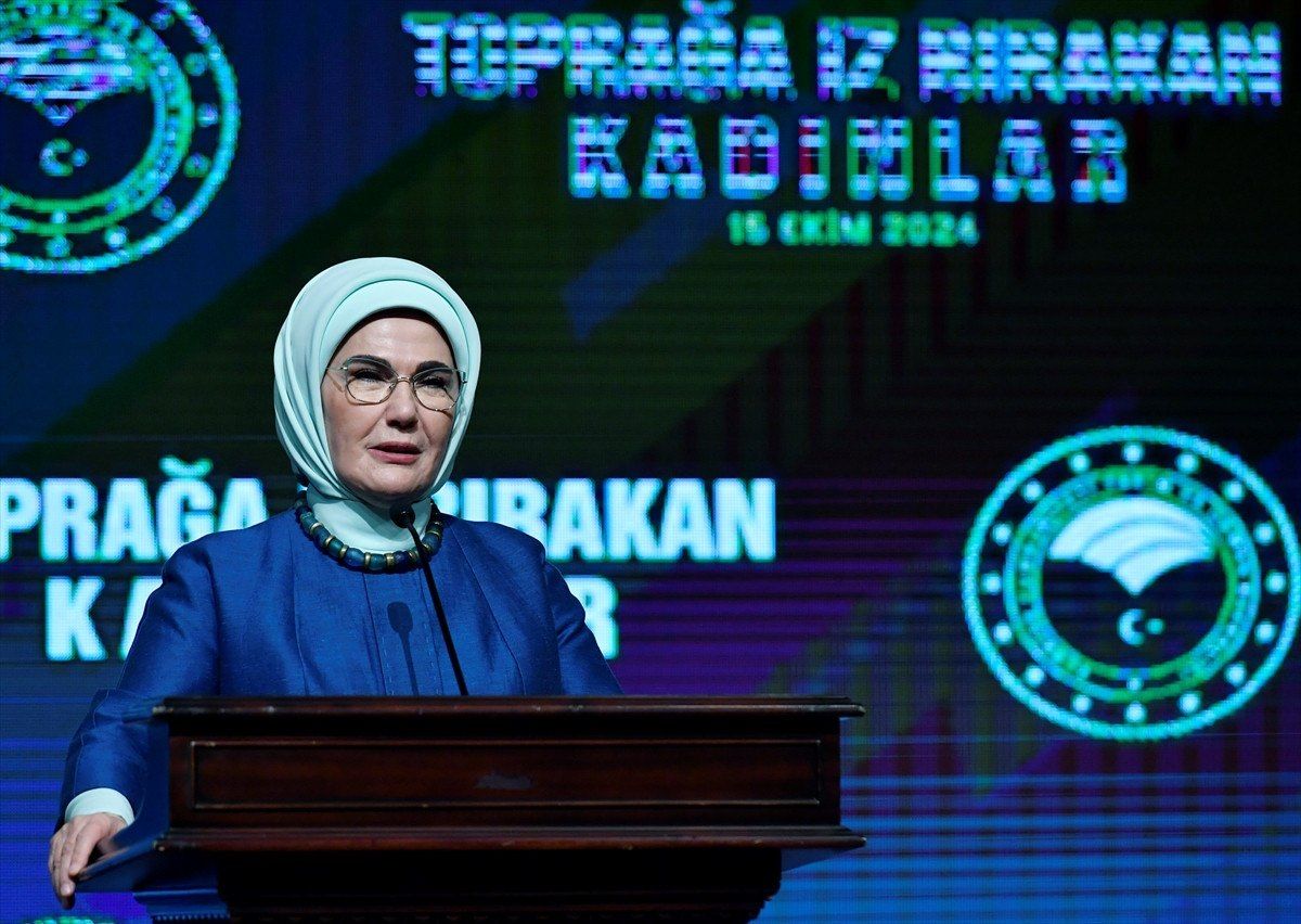 Kadınla toprak arasında, emeğe dayalı uzun bir geçmiş olduğunu vurgulayan Emine Erdoğan, “Anadolu toprağı nasıl bereketliyse, Anadolu kadını da çalışkandır, üretkendir. Tüm dünyada olduğu gibi, ülkemizde de gıda üretiminin yarıdan fazlası kadınların ellerinde gerçekleşiyor. Sizler, bir yandan vatanınızı doyurarak milletimize analık yapıyor diğer yandan henüz doğmamış evlatlarımızın hakkını gözetiyorsunuz.” diye konuştu.