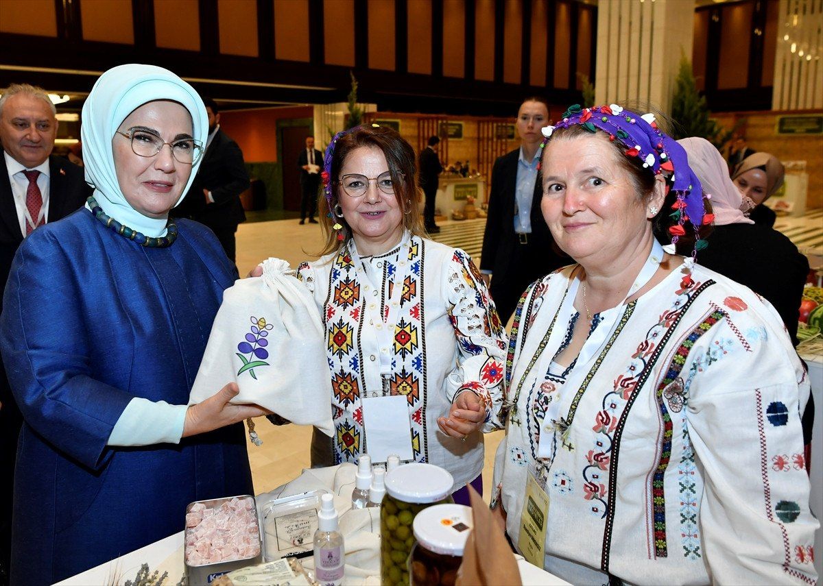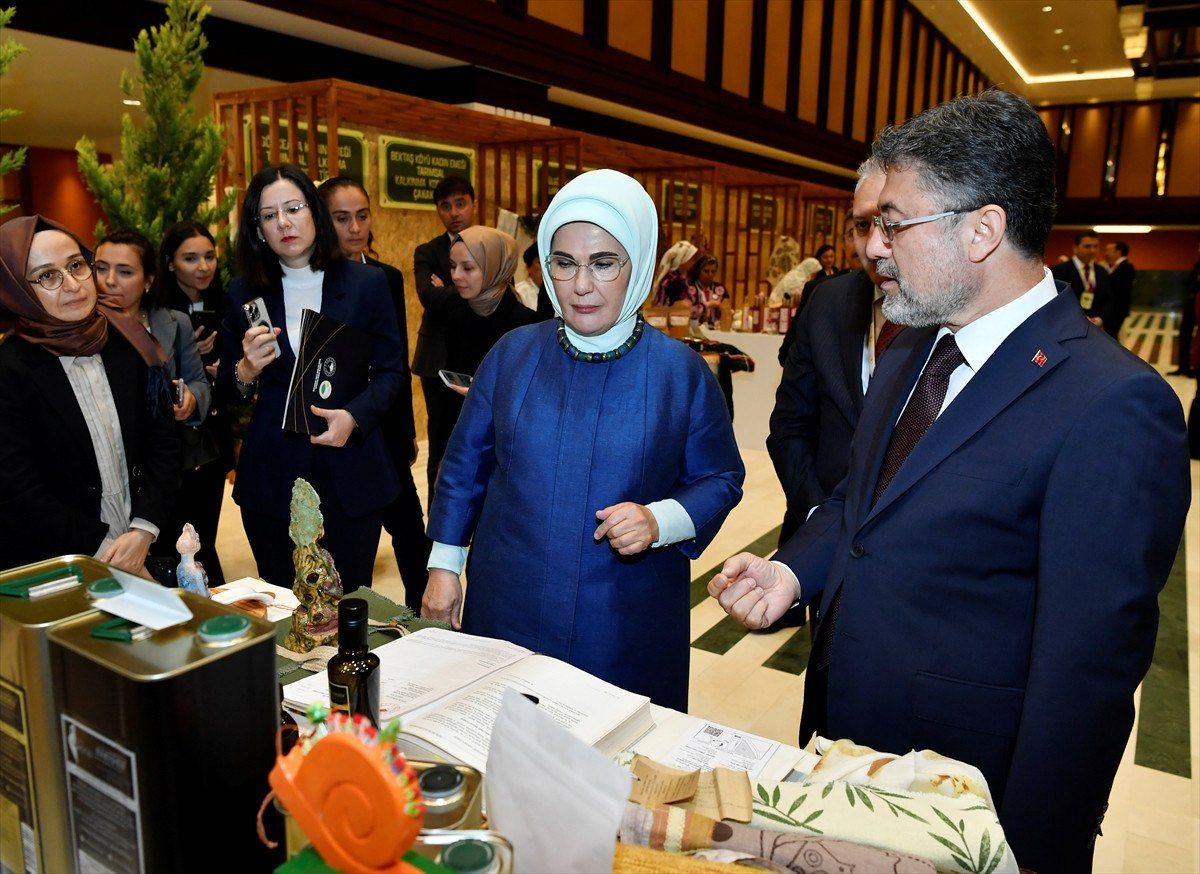 Emine Erdoğan, Bakan Yumaklı ile 15 Ekim Dünya Kadın Çiftçiler Günü dolayısıyla Türkiye’nin çeşitli bölgelerinden 18 kadın kooperatifince fuaye alanında açılan stantları gezdi.