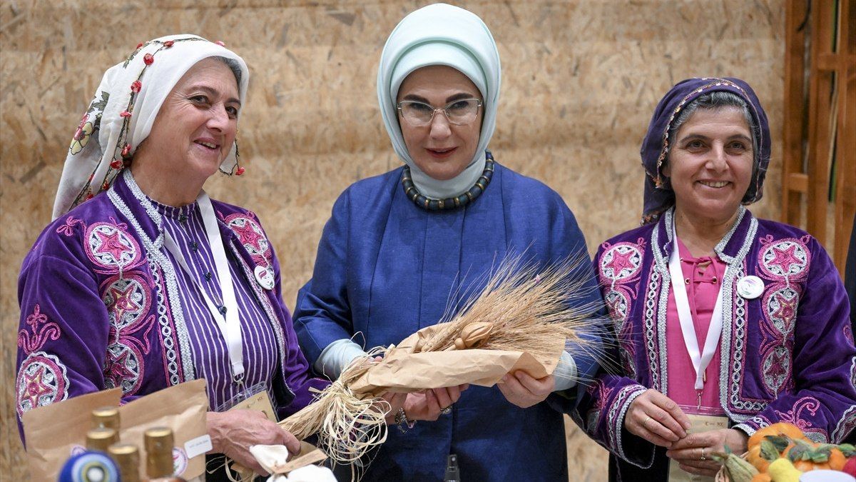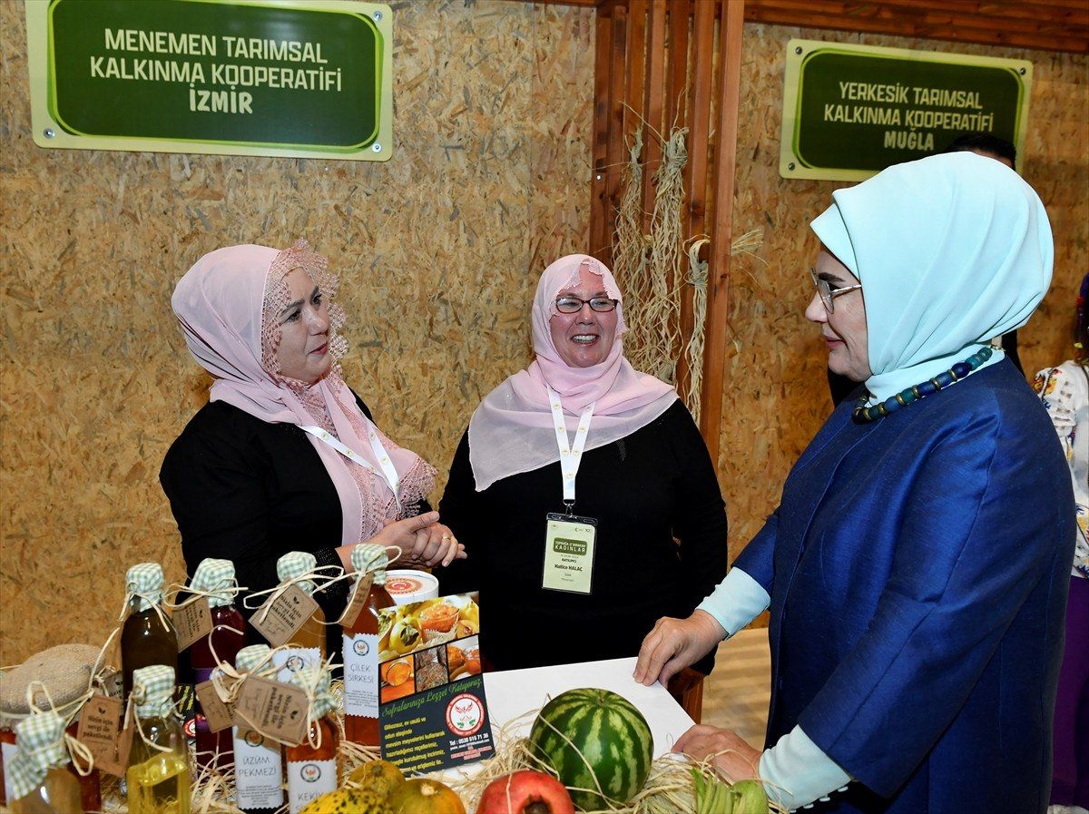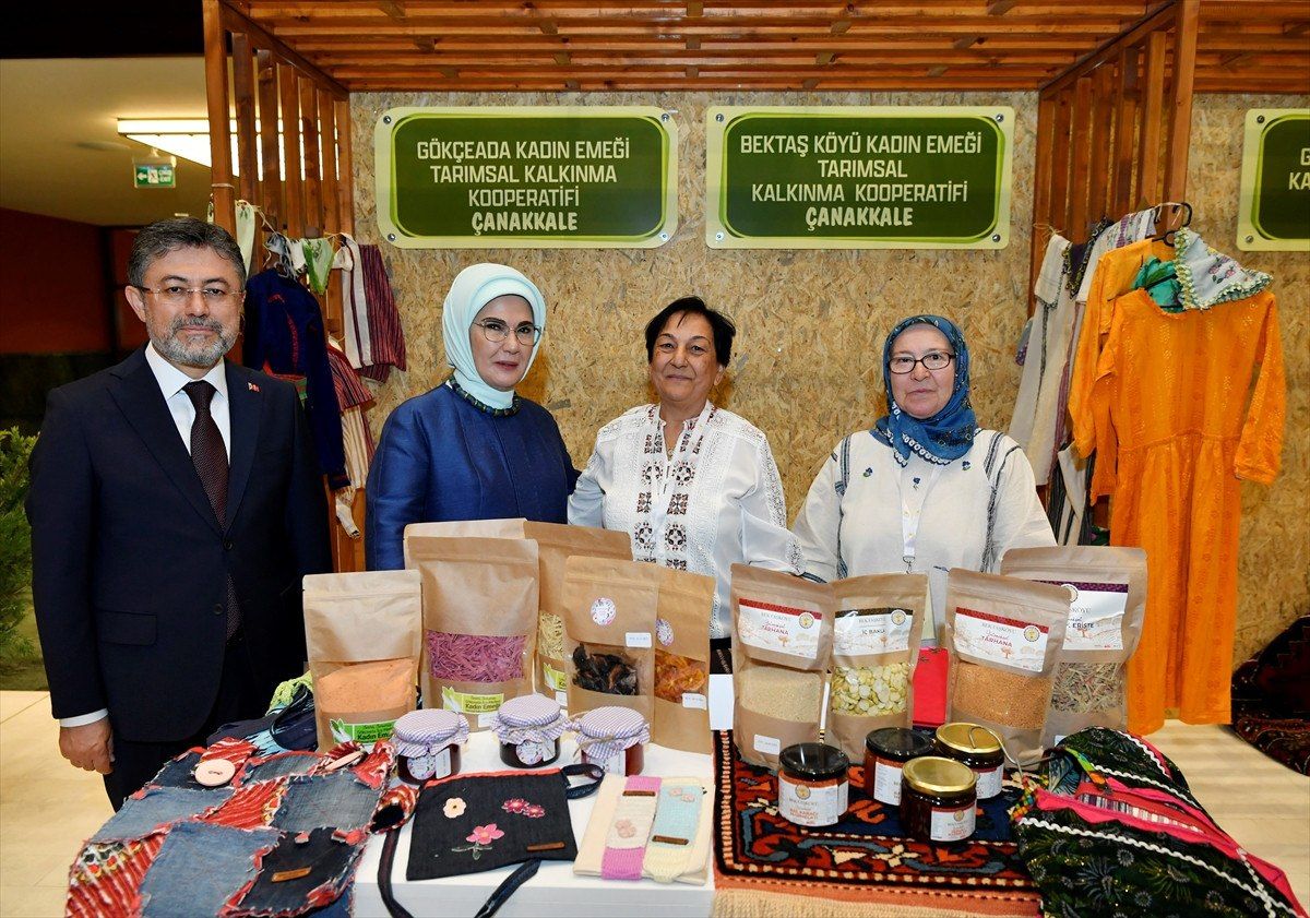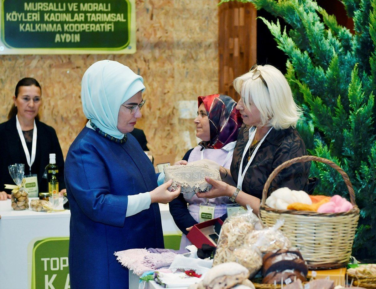 Fuaye alanında kadın çiftçilerin, pamuk dallarından yapılan buketle karşılanan Emine Erdoğan, daha sonra stantlarda kadın çiftçilerin AB Tescilli Coğrafi İşaretli ürünler ile Ankara Sofu kumaşından ürünler başta olmak üzere tarhana, erişte, marmelat, reçel, sabun, kolonya, gül yağı, dokuma ve çeşitli el sanatları ürünlerini tek tek inceledi.
