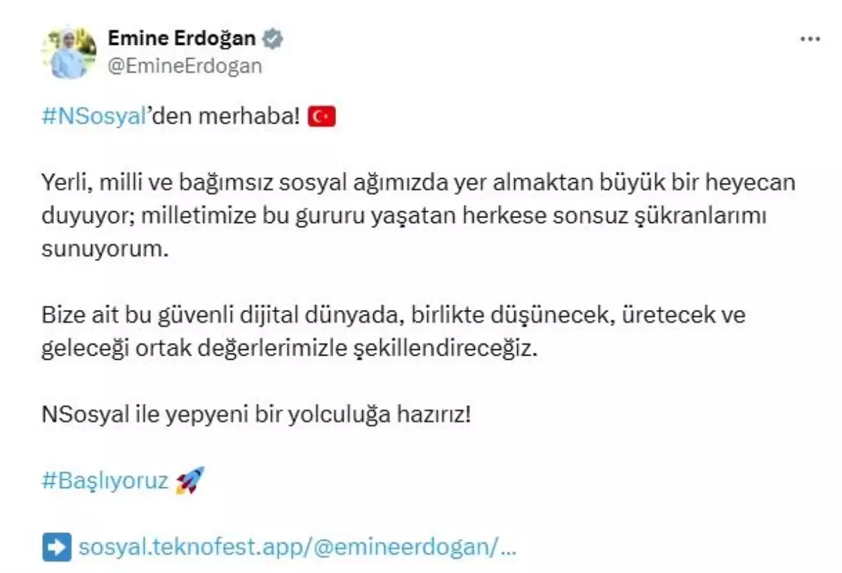 “NSosyal’den merhaba. Yerli, milli ve bağımsız sosyal ağımızda yer almaktan büyük bir heyecan duyuyor; milletimize bu gururu yaşatan herkese sonsuz şükranlarımı sunuyorum. Bize ait bu güvenli dijital dünyada, birlikte düşünecek, üretecek ve geleceği ortak değerlerimizle şekillendireceğiz. NSosyal ile yepyeni bir yolculuğa hazırız.”