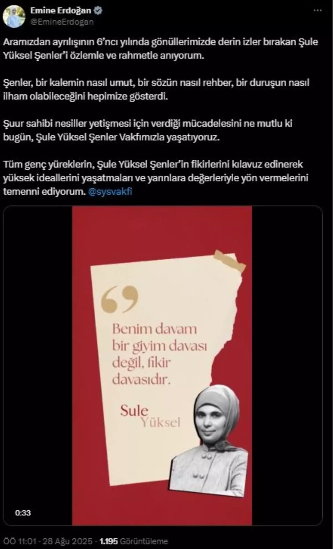 Emine Erdoğan, sosyal medya hesabından paylaştığı mesajda, “Aramızdan ayrılışının 6’ncı yılında gönüllerimizde derin izler bırakan Şule Yüksel Şenler’i özlemle ve rahmetle anıyorum. Şenler, bir kalemin nasıl umut, bir sözün nasıl rehber, bir duruşun nasıl ilham olabileceğini hepimize gösterdi. Şuur sahibi nesiller yetişmesi için verdiği mücadelesini ne mutlu ki bugün, Şule Yüksel Şenler Vakfımızla yaşatıyoruz. Tüm genç yüreklerin, Şule Yüksel Şenler’in fikirlerini kılavuz edinerek, yüksek ideallerini yaşatmaları ve yarınlara değerleriyle yön vermelerini temenni ediyorum” ifadelerini kullandı.