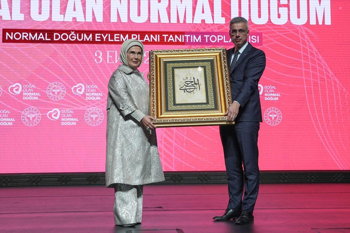 Emine Erdoğan, “Tüm bu kıymetli girişimler, ancak kadınlarımızın içine işlenmiş gizli kodları normal doğum deneyimiyle benimsemesi ve sahiplenmesiyle anlam kazanabilir. Bu yüzden, bütün anne adaylarımızı fıtratlarındaki bu mucizeyi, başka tecrübeyle edinilmeyecek bu eşsiz bilgeliği kucaklamaya davet ediyorum” ifadelerini kullandı.