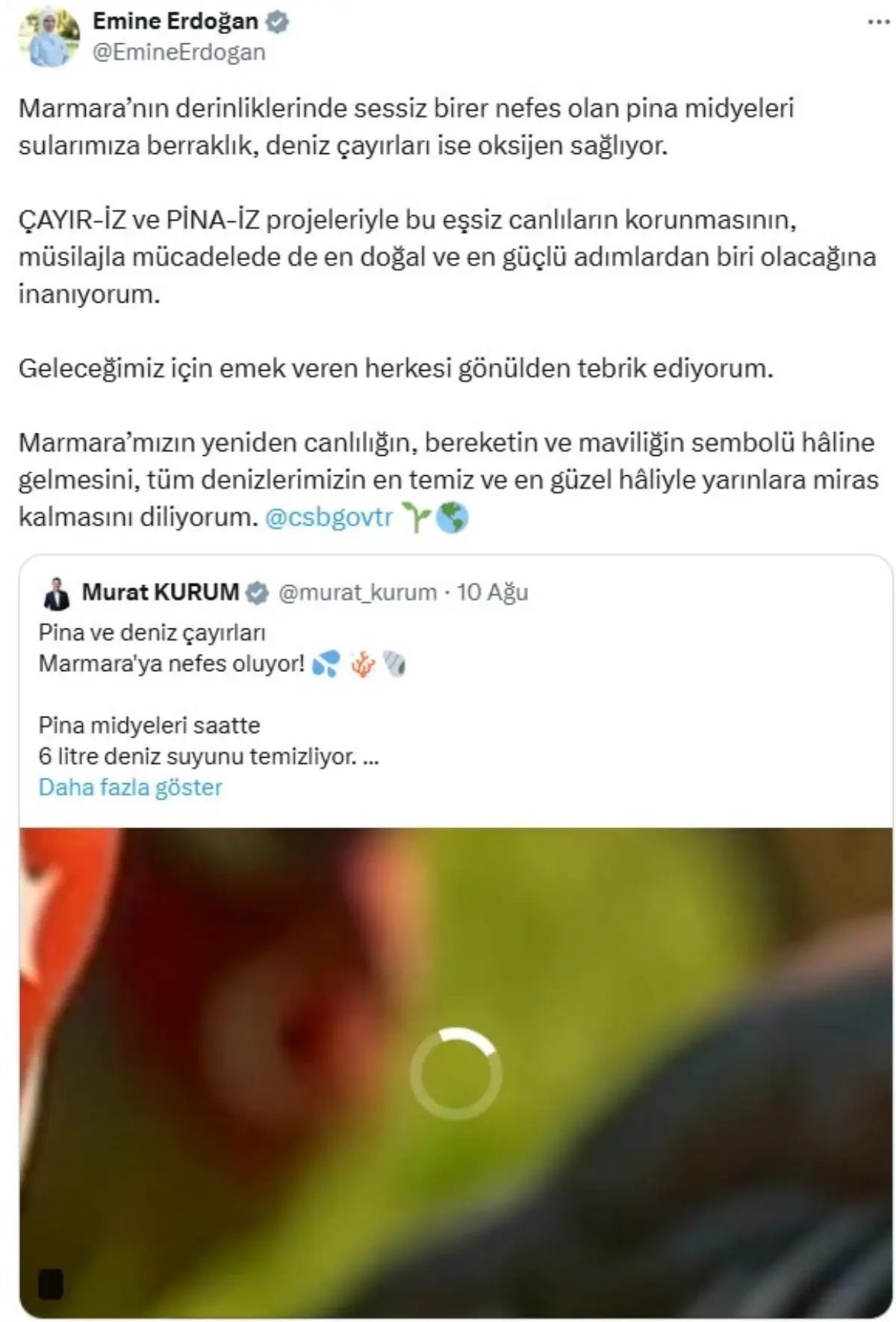 Emine Erdoğan, sosyal medya hesabından yaptığı paylaşımda, “Marmara’nın derinliklerinde sessiz birer nefes olan pina midyeleri sularımıza berraklık, deniz çayırları ise oksijen sağlıyor. ÇAYIR-İZ ve PİNA-İZ projeleriyle bu eşsiz canlıların korunmasının, müsilajla mücadelede de en doğal ve en güçlü adımlardan biri olacağına inanıyorum. Geleceğimiz için emek veren herkesi gönülden tebrik ediyorum. Marmara’mızın yeniden canlılığın, bereketin ve maviliğin sembolü haline gelmesini, tüm denizlerimizin en temiz ve en güzel haliyle yarınlara miras kalmasını diliyorum” ifadelerini kullandı.