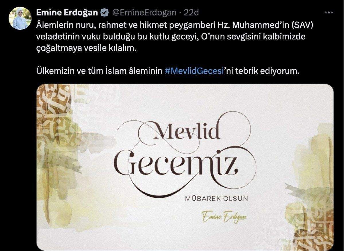 Bu gece idrak edilecek Mevlit Kandili öncesi Cumhurbaşkanı Recep Tayyip Erdoğan’ın eşi Emine Erdoğan’dan günün anlam ve önemine ilişkin bir paylaşım geldi.
