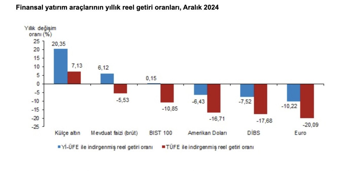 Türkiye İstatistik Kurumu (TÜİK), Aralık 2024 dönemine ilişkin finansal yatırım araçlarının reel getiri oranlarını açıkladı.
